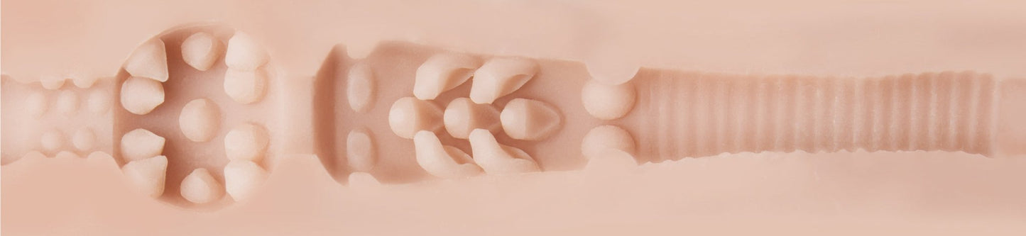 The Lotus arrangement is an entirely different experience. It features a series of bubble-shaped chambers and ribs designed to titillate as you go deeper. The Mini Lotus adds more chambers and includes a tight passage that will challenge your sexual wherewithal. You'll want to deploy the Fleshlube Elements Pack to feel even more thrills.
